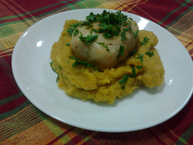 Sou uma grande fã de batata doce. É um alimento muito versátil! Tanto serve para entradas, acompanhamento de pratos principais e também de sobremesa. Hoje, a batata doce é o acompanhamento dos medalhões de maruca.